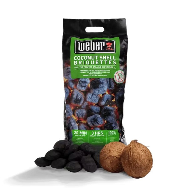 Брикеты для барбекю из кокосовой стружки Weber – это крутой экологичный вариант ноу-хау топлива, которое разжигается до 20 минут и гарантированно обеспечивает до 3 часов непрерывного приготовления на гриле. Следует заметить, что брикеты изготовлены из 100% натуральных материалов — карбонизированной стружки кокосовых орехов и крахмала тапиоки и вовсе не содержат в составе древесины. Крахмал тапиоки используется в качестве скрепляющего материала, который в свою очередь является естественным по сравнению с токсичными синтетическими элементами, оставляющими свое содержание на продуктах и попадающими в организм человека.